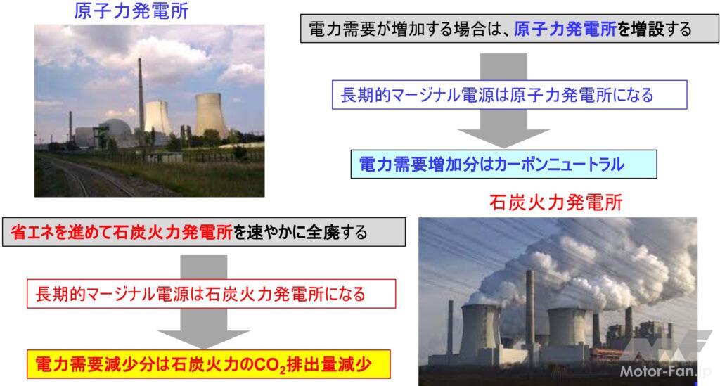 例えば、英国のように電力需要の増加に対して発電量が不足する場合は原子力発電を増設するという政策を取る国では、長期的マージナル電源は原子力発電になって、BEVの普及のような電力需要増加分はカーボンニュートラルになる。一方、ドイツのように石炭火力を廃止していく政策を取る国では、電力需要の増加は石炭火力の廃止速度を緩めるため、長期的マージナル電源は石炭火力になって、2030年の排出係数は電源平均の3.5倍、火力平均の1.5倍程度に増加する。BEVは確実にHEVよりCO2排出量が多い結果になる。