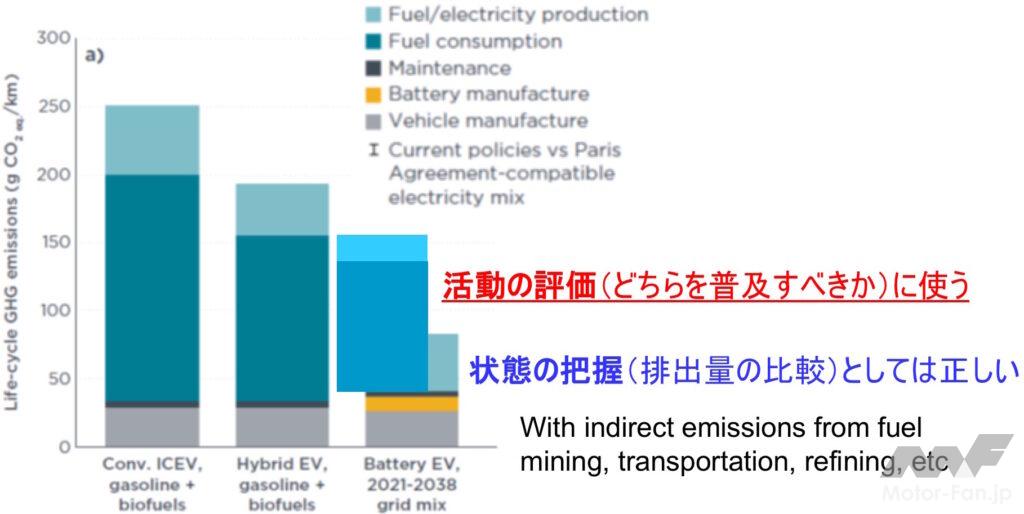 二つのCO2排出係数への理解が深まったところで、第1章の報告書Aの問題点について説明する。この報告書では、欧州で販売されるBEVとHEVのCO2排出量の比較も示されている。