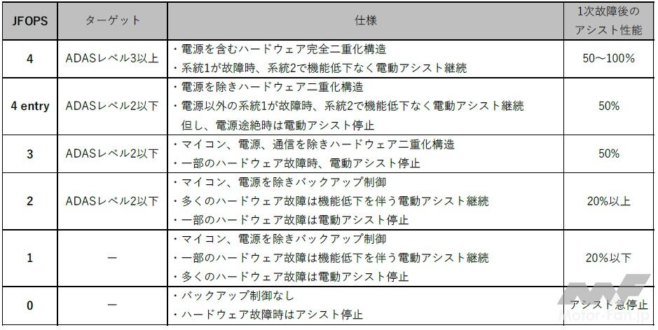 ステアリングは自動車の「走る」「曲がる」「止まる」の「曲がる」を担う重要な機能部品で、自動運転時にはより高いレベルの安全性が必要となる。ジェイテクトは自動運転の普及を見据え、ステアリング機能における独自の安全コンセプト「JFOPS※3」を定義、自動運転レベルに応じた安全性を備えるEPSの提供を可能とした。今回搭載されたEPSは、安全コンセプトで最上位となるJFOPS4を採用している。