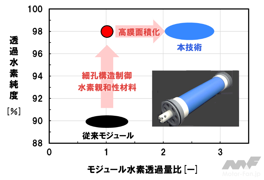 さらに、モジュール化に際し、主要構成部材の流路材を最適設計にし、流動抵抗を低減することで、無機分離膜モジュールと比べ、2倍以上の高膜面積化を実現した。これにより、モジュール1本あたりの水素透過性が向上し(図2)、水素精製プロセスに必要なモジュール本数を50%以下に削減できる。さらに、開発した分離膜を組み合わせることで、モジュール本数を75%以上削減でき、大幅な省スペース化が期待できる。