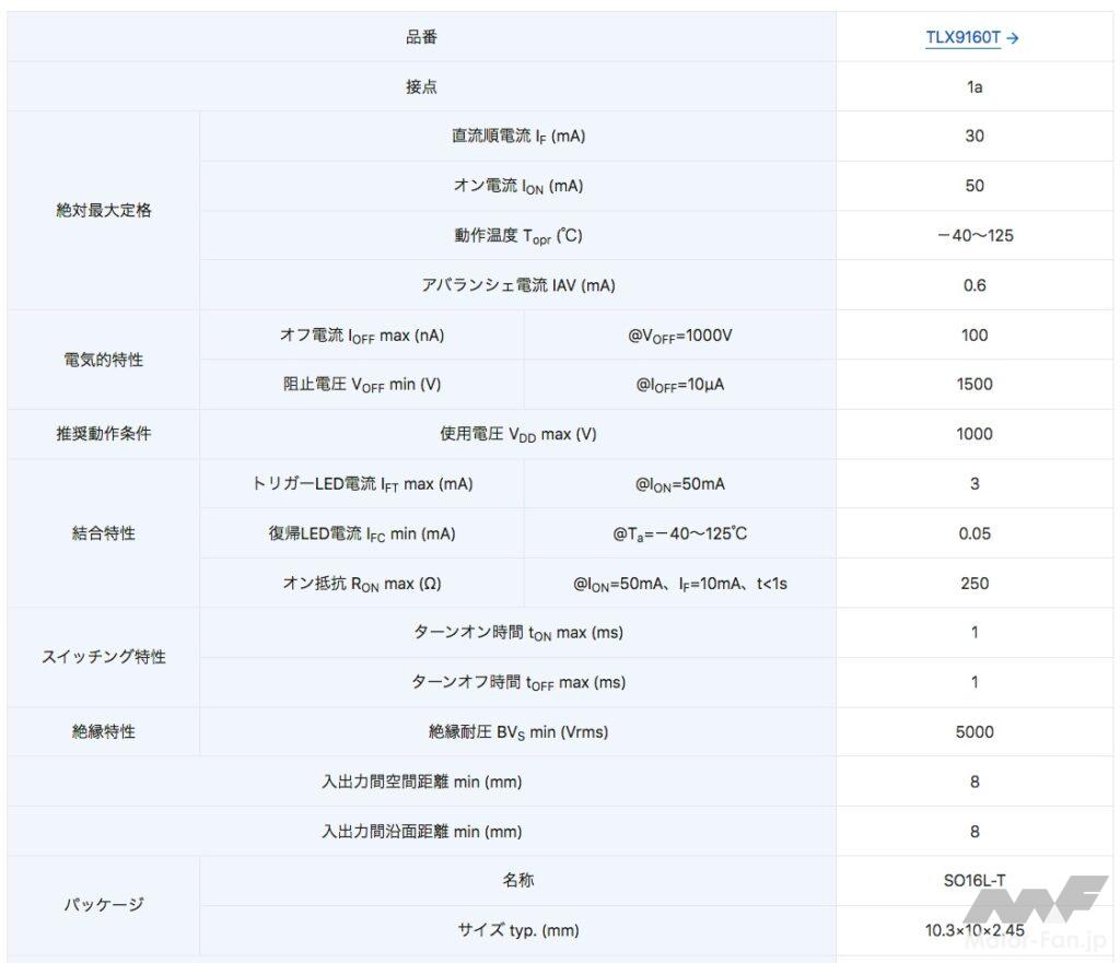新製品は、高耐圧MOSFETの搭載により、最大阻止電圧1500Vを実現。国際規格IEC 60664-1の材料グループⅠ[注1]であるCTI[注2]が600を超える樹脂を採用し、11ピンから14ピンの4つのピンをSO16Lパッケージから無くしたSO16L-Tパッケージを採用することで、受光側の沿面距離5mm以上[注3]を確保している。これにより、IEC 60664-1に則って、使用電圧1000Vに対応可能。バッテリー電圧1000Vまでの高電圧の車載用途に適している。