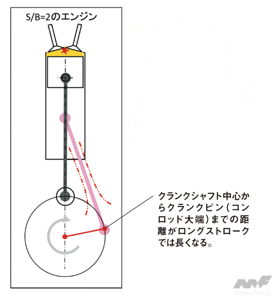 トルク重視型エンジンはロングストロークだと言われる。右の図はS(ストローク)/B(ボア)比が2、つまりストロークがボアの2倍というエンジンを示す。コンロッドがシリンダーライナーと干渉するギリギリのところで設計されたエンジンだが、ピストンが上死点から下死点まで移動する距離が長いぶんだけ受け取る仕事量が増えると考えていい。当然、エンジン高も高くなり車両搭載性の点で実現が難しい。