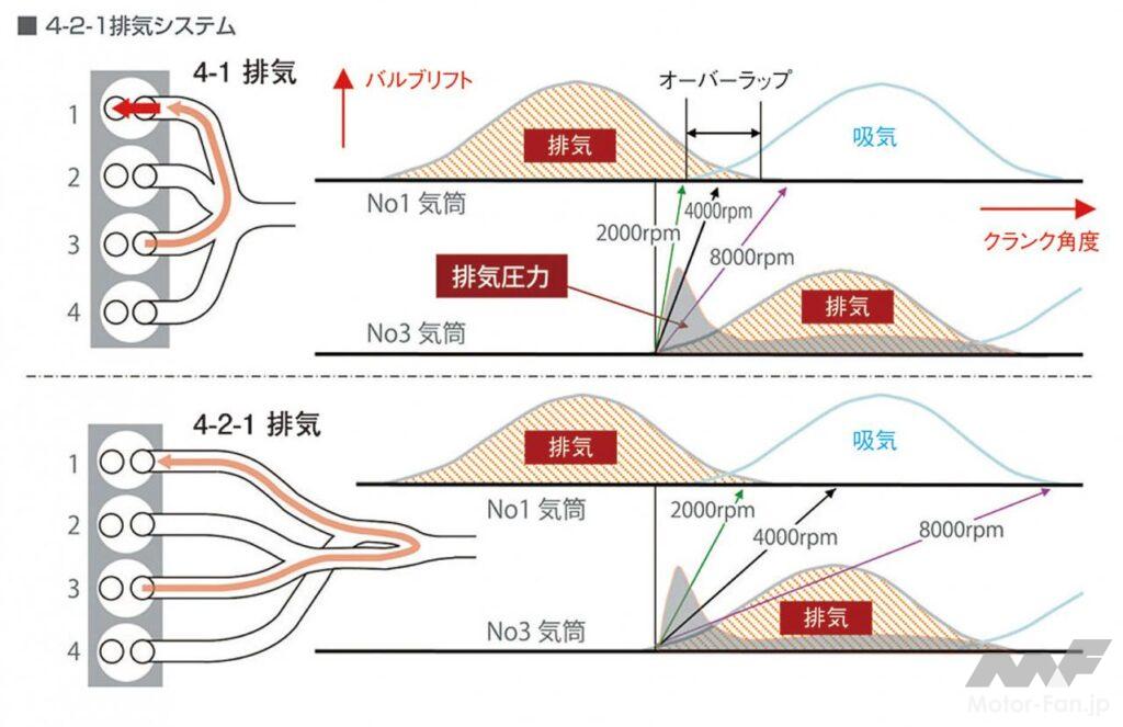排気は圧力波でもあり、「波」と言うだけあってそれは周期をともなう間欠的な振動エネルギー(脈動)の一種だ。振動があるということは排気管の圧力はプラスとマイナスがあり、周波数はエンジン回転数に関係なく排気管の長さと排ガス温度で決まる。そこで最高出力を発揮する回転数で発生する排気の周波数を割り出し、排気管長を調整して別の排気管に入り込んだ圧力波が排気バルブが開く時期に負圧になるように設定すれば、今度は排気をマイナスの圧力で引き出すことができる。そのためには管長をある程度確保すると同時に、排気の順序に併せて管を集合させる必要がある。