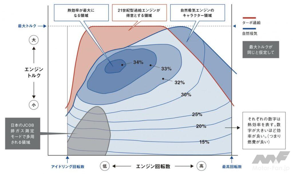 上のグラフは、実在するエンジンをベースに考えた架空のエンジンの全開全負荷トルク曲線に熱効率を等高線で書き込んだものだ。もっとも色の濃い青の部分が燃費の目玉。この部分でBSFCはもっとも小さくなる。この目玉を大きくすることがエンジン設計者諸氏の課題である。少々失礼な言い方をすると、目玉の小さいエンジンは「CVTを使ってなるべく目玉内にとどまる時間を長くする」ようにすると見かけ上のBSFCは小さくなる。ドライバーに嫌われない変速制御ができれば、これも美点になり得る。