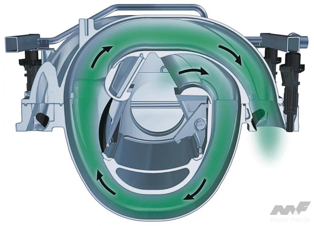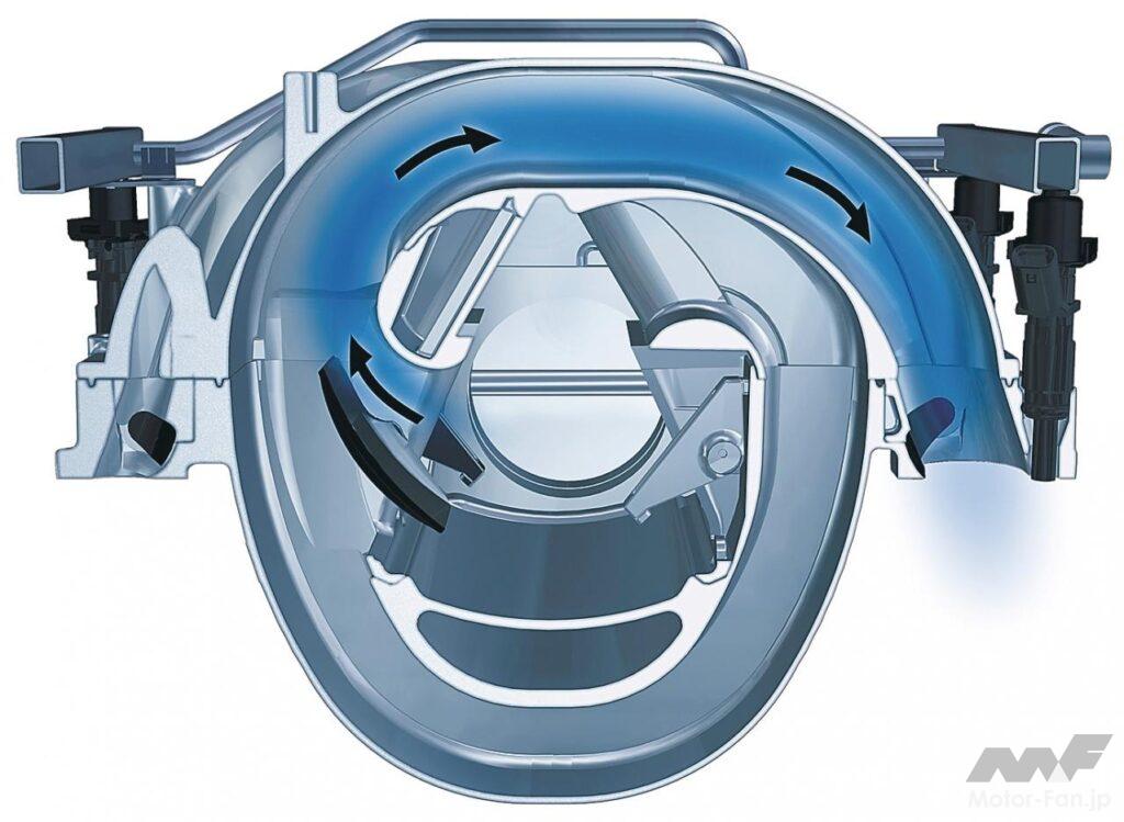 空気吸入システムの基本機能は、1)きれいな空気をシリンダー内に導くこと、2)消音すること、3)できるだけ多くの空気をシリンダー内に導くことが挙げられる。このうち、3)の「充填効率を高めること」に着目して機能を整理してみよう。まず、吸気管の曲がりを少なくすること、内面を滑らかにすることによって通気抵抗を低減する方法がある。