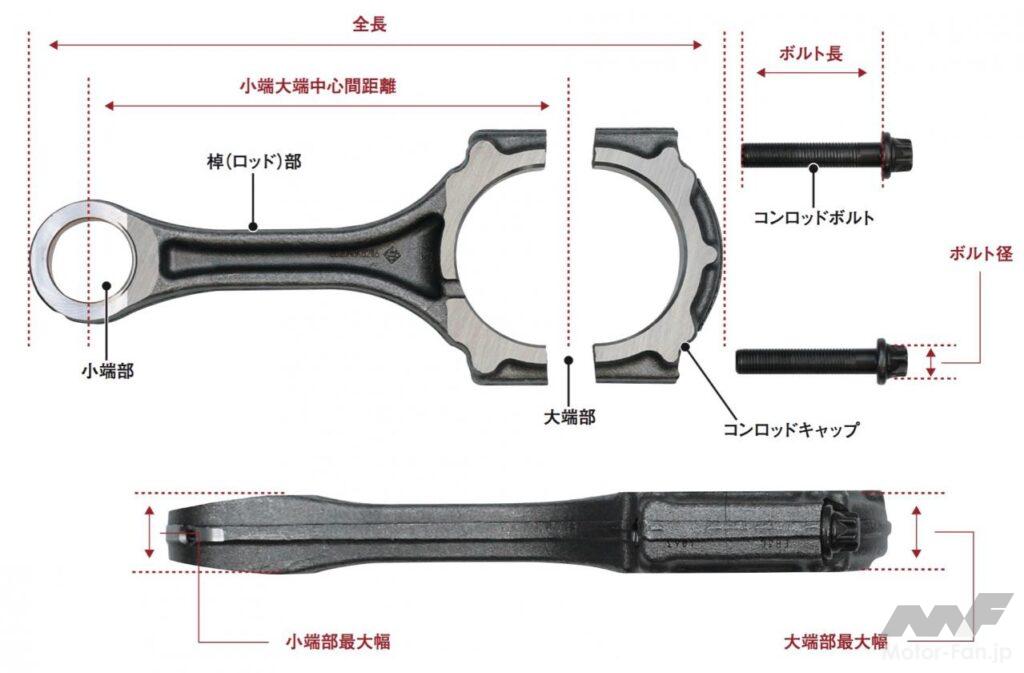 コンロッドには、大小端円周には引っ張り、大端肩部には引っ張りと曲げ、棹部には引っ張りと圧縮、さらに捻りという複雑な応力がかかる。そのため小端と大端をつなぐ棹部は両端を左右二本でつなぐのが理想だが、ビッグボアでないとシリンダー下部に当たってしまうため、通常は一本で支える。一般的なのは上から見た断面がI形状のもの。ただし金型による鍛造が必須となるため、切削加工が可能なH断面のものもあるが、形状としては理想的ではない。