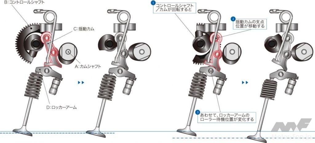 メカニズムは、揺動カムを用いてロストモーションを生み出す機械式可変機構。2001年の第1世代は小リフト時に吸気バルブの流路抵抗が生じる弱点があったが、2004年の第2世代ではそのネガを解消すべく機構に手を加え、小開角のリフトをより高く設定。小リフト時には2つの吸気バルブのリフト量を変え、スワールを発生させる制御も取り入れた。高精度直噴システムのインジェクターと干渉しないよう、サーボモーターの位置を変更したシステムを第3世代と呼んでいる。