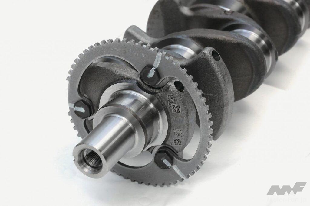 燃費を狙い、ピン径/ジャーナル径は比率を1:1にした。ピン径よりもジャーナル径の方が抵抗に対して感度が高いため、ジャーナル径は小さくしたい。突き詰めた結果、1:1が最適値だった。細くなるジャーナル径に対してピン径が太くなると、それにともなって往復運動系が重くなり、カウンターウエイトも重くなると予想したが、それほどではなかったという。もうひとつの特徴は、そのカウンターウエイトの形状がまちまちなこと。クランクの曲げはセンター付近の方が両端より大きい。そうした状況でのメタルの油膜厚さが最適になり、かつ軽量化につながるよう設計した結果だ。また、ブロックの共振点とクランクの曲げ共振点をずらす設計を形状・剛性に折り込んでいる。