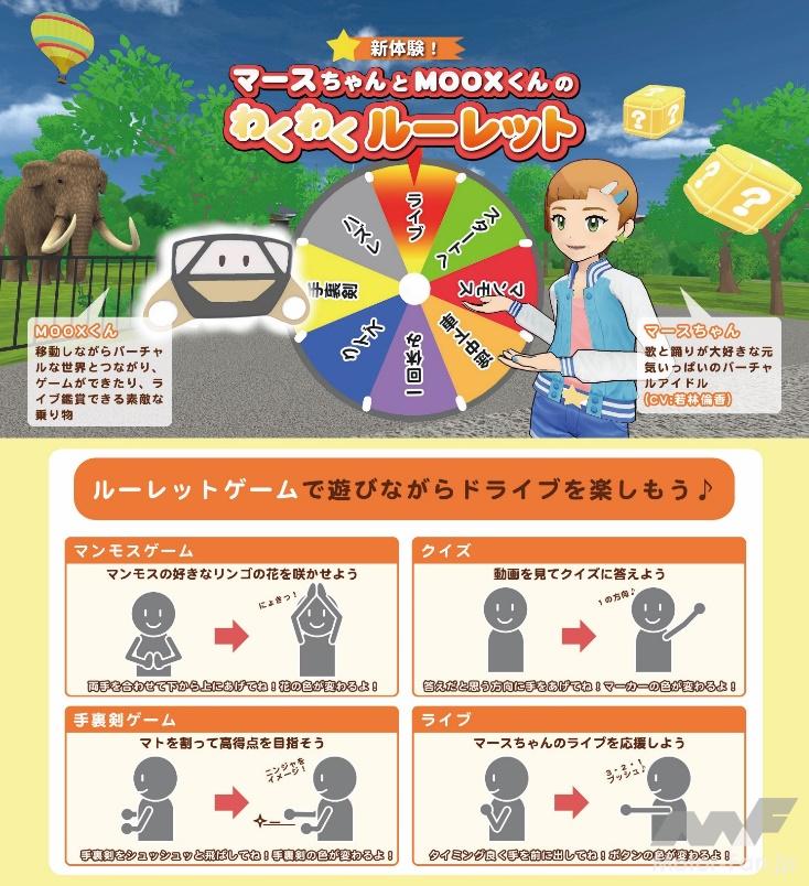 ※3 「MOOX on FCバス」とは、新たな移動体験を提供するコンセプト車両。3D音響システム※4やXR技術を備えたライドアトラクション用バス※5「MOOX」内で体験できる。MOOXはMobile boxの略で多様なニーズに対応する車室空間コンセプトであり、それを小型バスに搭載している。