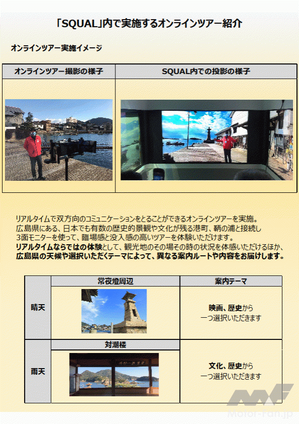遠く離れた観光地(広島県福山市鞆の浦)とモリコロパークをドコモの5Gネットワークで接続し、車室内の三面の大型スクリーンを活用して臨場感あふれる観光地の様子を投影することで、実際にその場所を訪れたかのような体験ができる「オンラインツアー」を提供する。