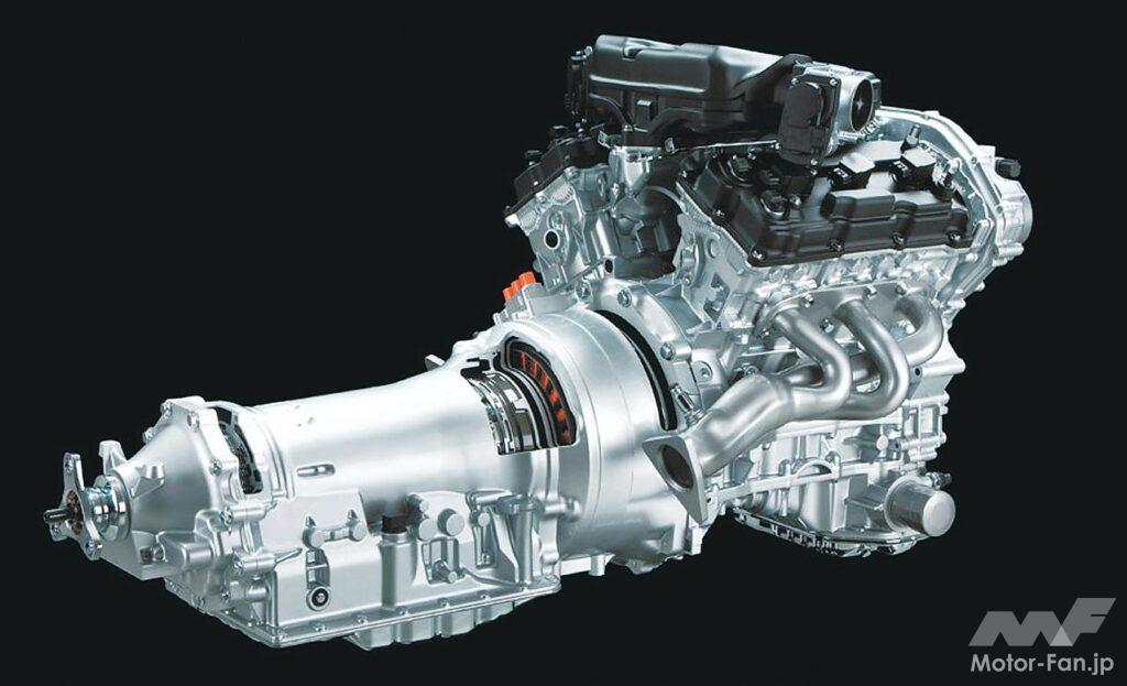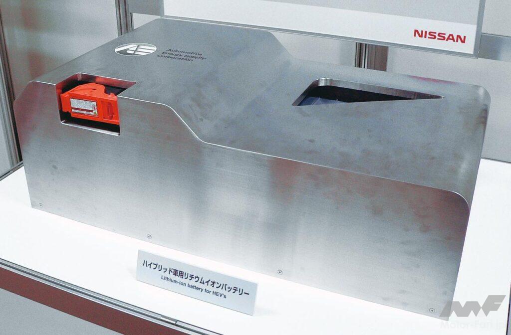 下は試作時の写真。1モーター+2クラッチのパラレルハイブリッド。実験車両のエンジンは自然吸気3.5ℓのVQ35。ジヤトコ製7速ATのトルクコンバーター部分に乾式クラッチ、その後方にモーター~7速ATのギヤセット~湿式クラッチとつづく。動力伝達系が非常にコンパクトに収まっているが、これもこだわった部分。