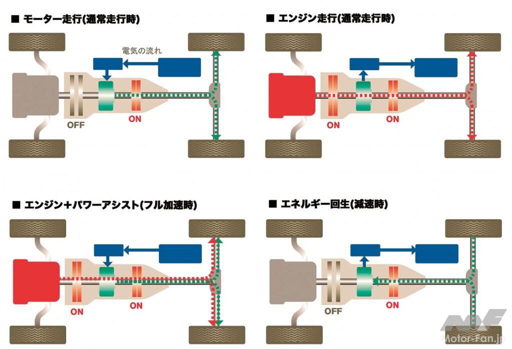 アクセルを少しでも戻すと、すかさずエンジンは停止する。踏み込み量を大きくするとエンジンが始動して乾式クラッチがつながるが、速度域が高い領域ではつながる際のショックはさほど気にならない。モーター+エンジンの走行でも、エンジン回転は控え目。主役はあくまでモーター。エンジンの力が必要なときだけ必要最小限使うといったスタンス。モーターアシストならぬ、エンジンアシスト的な使い方だ。