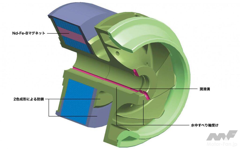 モーターも軽量化・低コスト化のための新機軸が満載だ。ポンプのインペラーとモーターマグネットを一体化しているが、過酷な冷却水環境下でも軸受けの耐摩耗性・防錆性を確保するために、シャフトとスラストワッシャーにDLCコーティングを施した。「過酷な冷却水環境」と書いたが、世界中で販売されるプリウスだけに、開発陣は世界中の水を集めてテストした。冷却水も地域によって塩素濃度が違うなど様々だという。