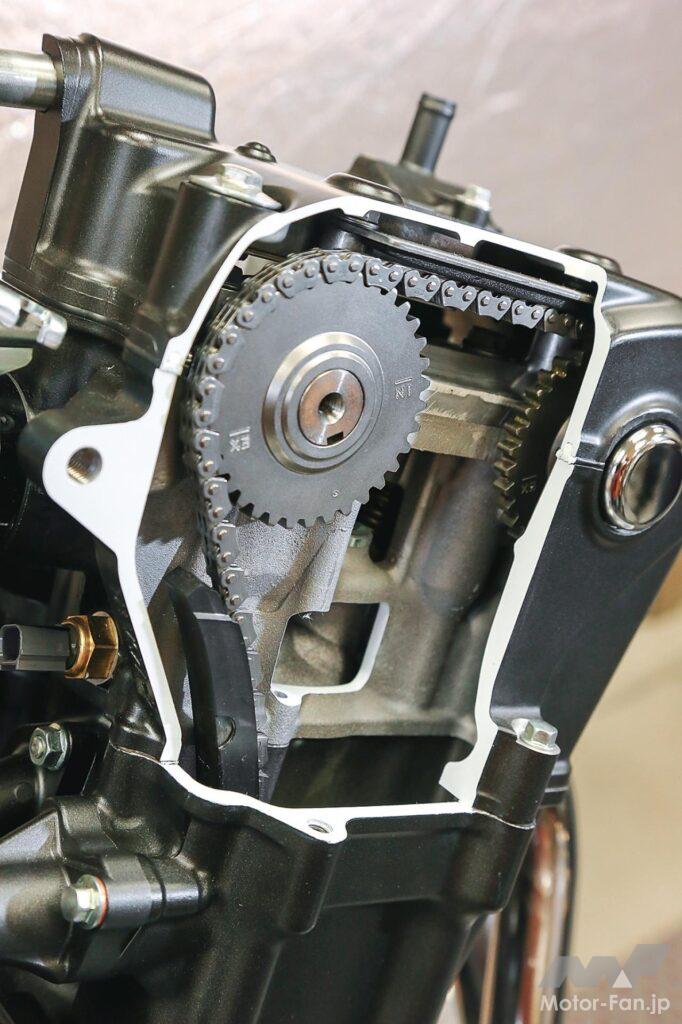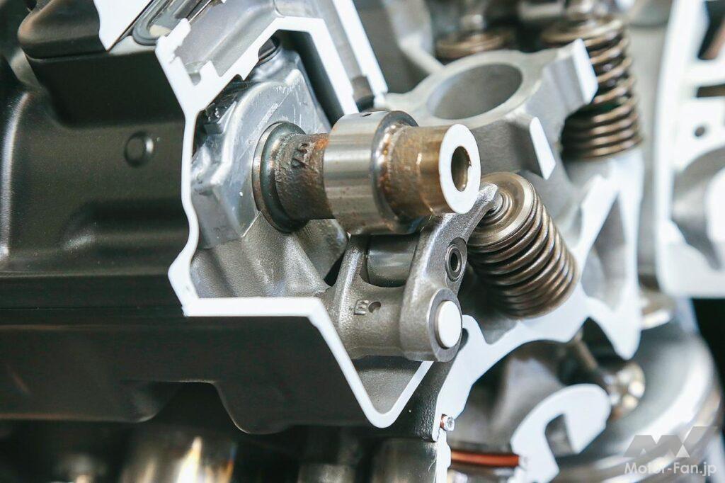 エンジン右サイドのサイレントチェーンで駆動されるツインカムのバルブメカにはローラーロッカーアームが採用されている。NC700系とも異なり、ひとつのカムがローラーロッカーを介すことで同時に2つのバルブの開閉を担う。超高回転を追求するとなれば動弁系の重量は軽いに越したことはなく、直打式を採用するのが一般的だが、この新型400ccは当初から最高出力の発生回転数を9500rpmに設定して開発されており、そこでフリクションロスの低減を重視してローラーロッカーが採用された。
