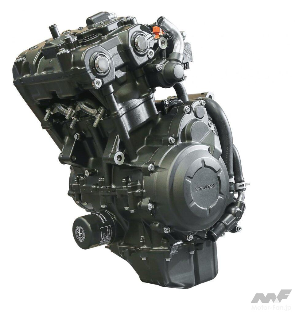 この新型エンジンは水冷の並列(直列)2気筒で、DOHC4バルブ。ボア×ストロークは67.0mm×56.6mmというショートストロークタイプの399ccだ。左右気筒のボアピッチは74mmで、腰上のスリムさはかつての同排気量の空冷単気筒をしのぐものがある。ちなみに67mmというボアや74mmというボアピッチはピュアスポーツバイクであるCBR600RRの4気筒エンジンと同じで、技術やデータの共有化が図られている。当時はエンジンの概要発表のみで、出力などのスペックや、その搭載車両の仕様・登場時期などについては明らかにされなかったが、ホンダは「スポーティーでありながら扱いやすい、高品位でベーシックな、次世代を見据えたスポーツエンジンとして開発した」と述べた。