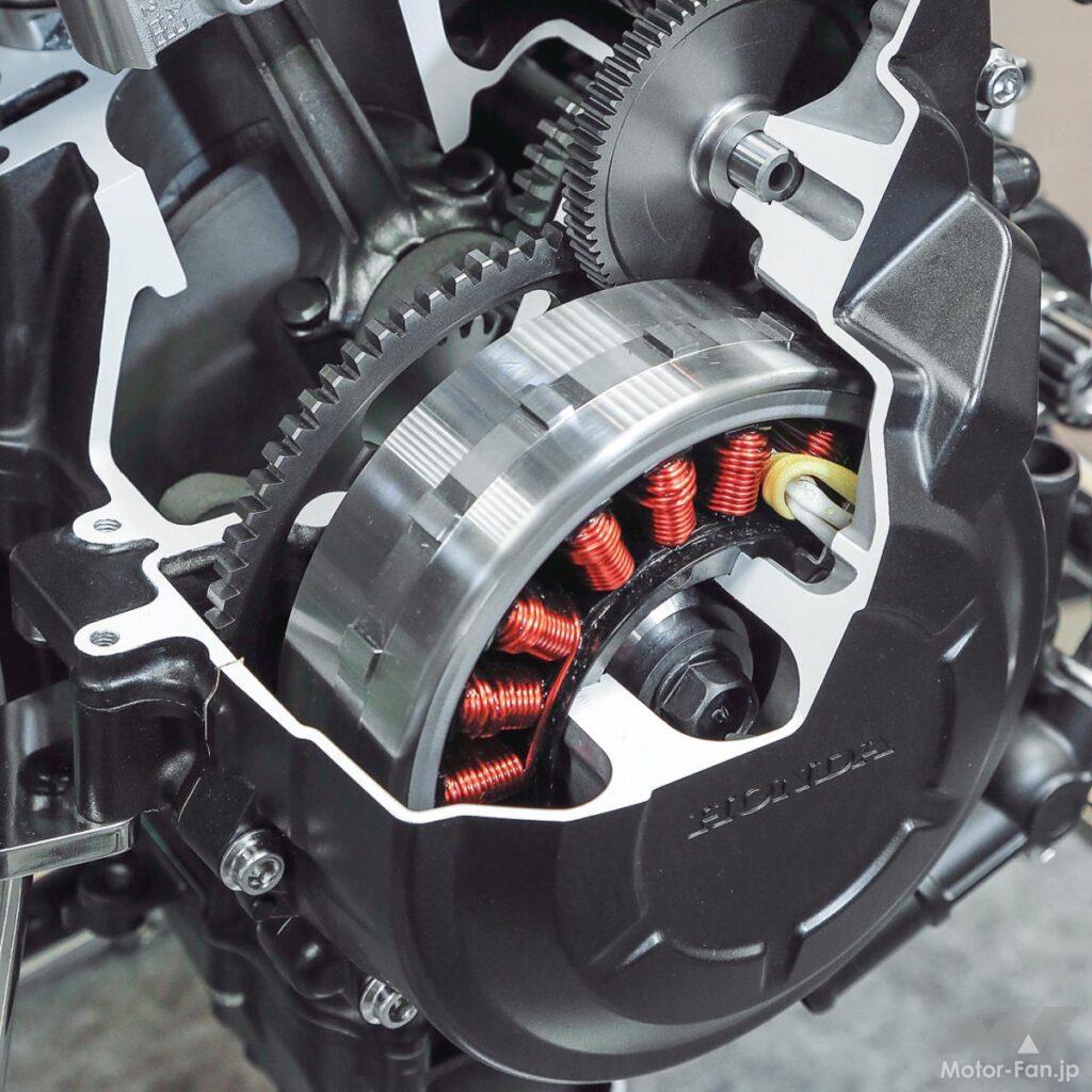 とはいえ、9500rpmも回るエンジンなのだから決して低回転型ではない。そのため、タペット調整にはスクリューアジャスターを持たないシンプルで軽量なシム式が採用されている。この点もNC700系とは異なっている。当然ながら動弁系の軽量化策もおろそかにはできないわけだ。追従性に優れるダブルピッチのバルブスプリングも設定荷重は控えめ。それらのバランスにより、スムーズで伸びのいい回転フィーリングが稼ぎ出されている模様だ。
