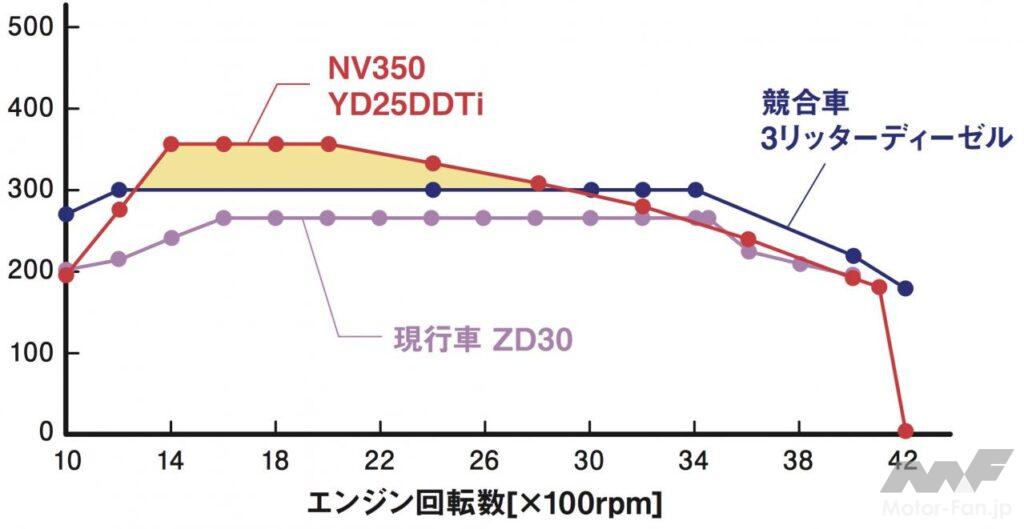 従来のYD25DDTiをより商用車向きとしながら燃費や環境性能を向上するべく、タービンなどに変更などを加えた結果、最高出力は95kW(129ps)に抑えられているが、わずか1400rpmで最大トルクを発生、そのまま2000rpmまでフラットに最大トルクが続くという、商用車の実用シーンでストレスなく使えるトルク特性に仕上げられている。前モデルに搭載されていた3ℓディーゼルのZD30から排気量を縮小したにもかかわらず、ほぼ全域でそれを上回り、実用域においては圧倒的といえるトルクを発生。356Nm(36.3kg-m)という最大トルクはクラストップの数値となっている。
