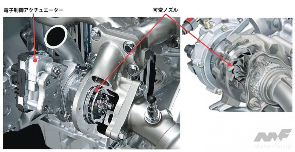 燃費性能の向上と、環境性能追求のためのダウンサイジングにターボの装備は必須というこうとで、ターボは引き続き装備されることになったが、商用車にふさわしいパワー/トルク特性の確保と、環境性能の向上を図るため、サイズなどの仕様を変更(ボルグワーナー製の可変ノズルターボを採用)。その他シリンダーヘッドにも大幅に手を入れるなど、徹底的なブラッシュアップが図られている。