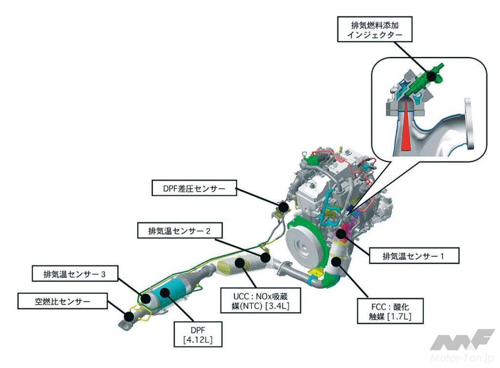 3代目パジェロで投入した4M型をベースにコモンレール化を図るなどし、現行国内規制に対応させたエンジン。ターボ直下、容量1.7ℓの酸化触媒の上流に、DPF再生の昇温に使う排気燃料添加インジェクターを追加している。