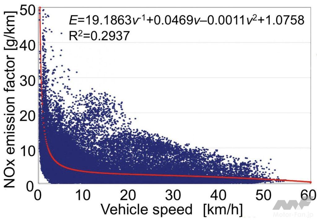 ■ 同じ速度でも瞬時の排出係数を考えるとばらつきが大きく沿道局所でも排出量推計には適さない