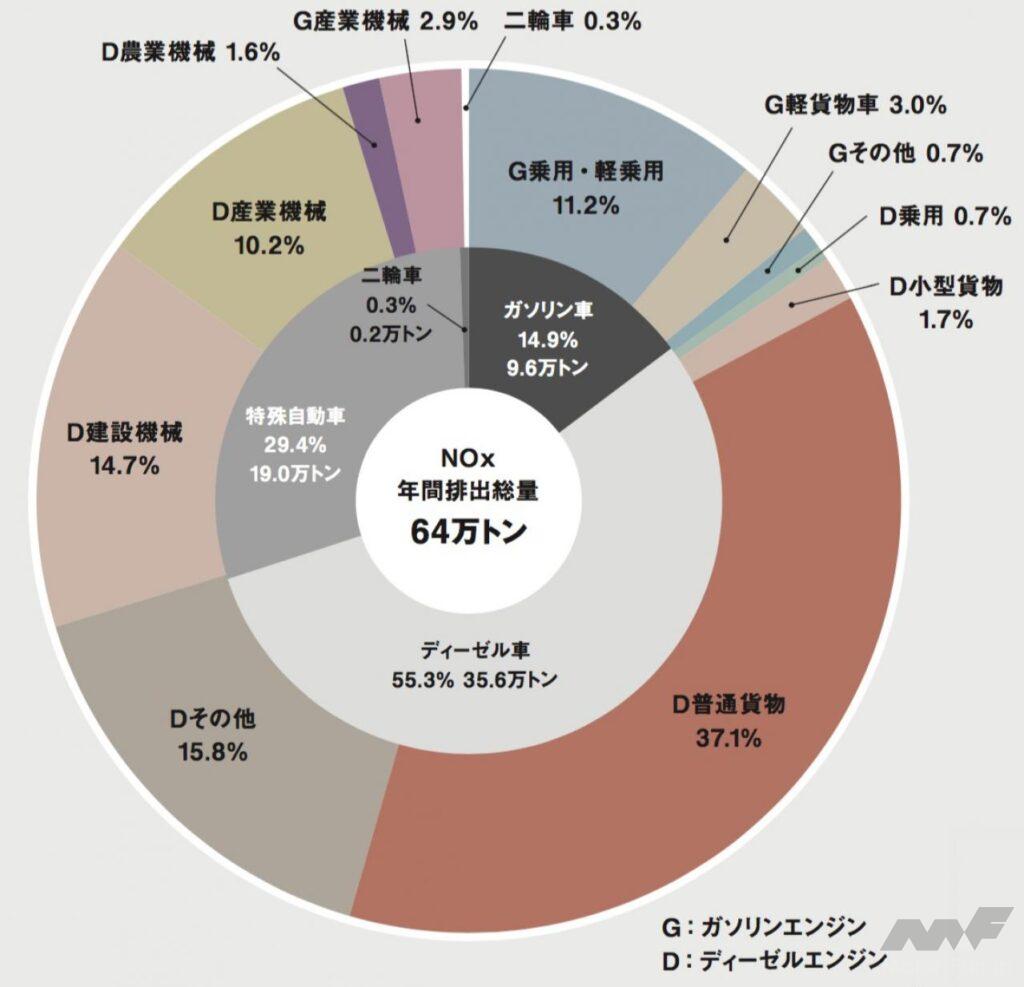 飯田:実際に日本まで飛んできていますよ。PM2.5だけではないのです。一方、日本の道路を走っているガソリン車から出たNOxは2010年の段階で移動発生源由来のNOxのうち15%程度です(グラフ参照)。CO₂発生では55%を占めますがNOxでは優等生です。それよりも2500万台あるディーゼル商用車です。この寄与率は55%です。さらに言えば、普通貨物ディーゼル車と同等以上の量のNOx排出を特殊自動車が占めています。