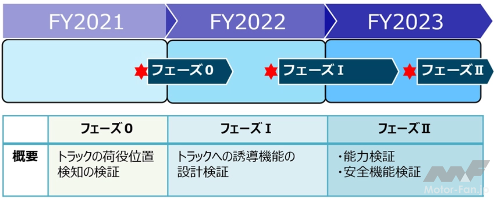 将来的には、荷物が乗ったパレット(荷役台)をAGFが自動で取り上げ、トラックの荷台へ直接積み込む一連のシステムを構築する。トラックへのパレット積み込みは、荷積みのスピードやトラックの停止位置、トラック内のパレットの設置位置などに高い精度を求められることから、これまで有人フォークリフトでの運用が一般的だったが、三菱重工が培った自律化・知能化技術と三菱ロジスネクストの自動化技術を活用することで、トラックの荷積み・荷降ろしにおける省人化と省力化に貢献する。