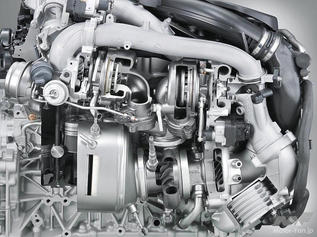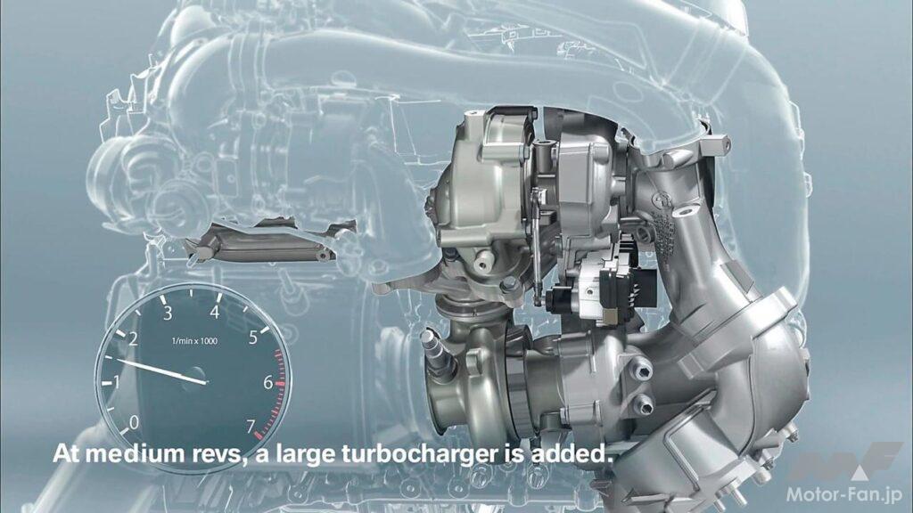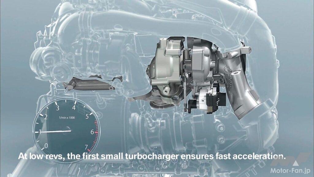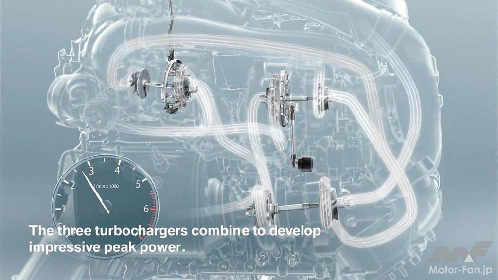 ふたつのターボによる二段過給や、運転状態に応じ作動させるターボの数を変化させるシーケンシャル動作などを組み合わせることで、あらゆる運転状況において最適な応答性と過給圧を確保するというものだが、もはや作動図を見た程度で理解することは困難なほどに複雑なものとなっている。高過給に対応するコモンレール式直噴システムの最大噴射圧力は2200bar。インジェクターには応答性に優れるピエゾ式を用い、複雑なシステムに求められる、きめ細かくも迅速な燃料制御を実現している。