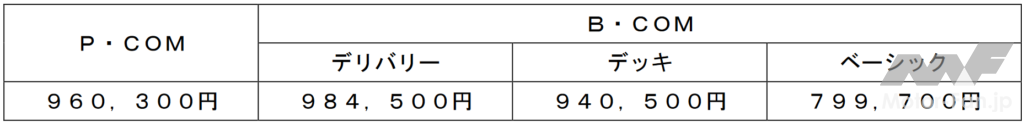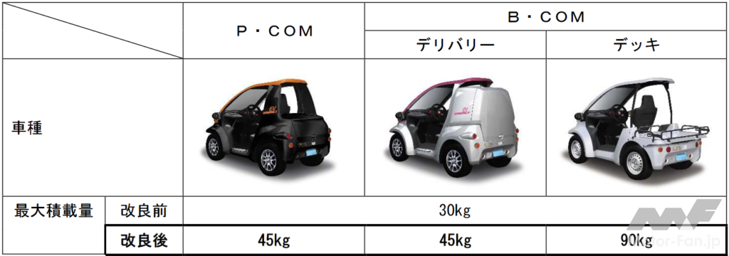 宅配、宅食などの小口配送サービスをはじめとする顧客からの要望を受け、3つのバリエーションごとの使われ方に合わせて最大積載量が拡大された。P・COMとB・COMは弁当などの宅食配達に、B・COMデッキは飲料などの宅配に多く利用されており、1回の積載量が拡大することで、拠点への戻り回数の低減にもつながり、配達時間・移動時間の短縮につながるとされている。