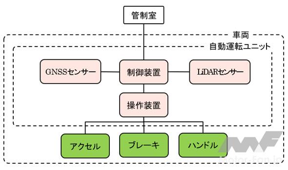 地上側管制室から,制御装置に無線通信で指示することで,車両が運行を開始する。運行中はセンサーで収集した車両の位置・速度などの情報をもとに,制御装置がアクチュエーター(物理制御機構)とバイワイヤ(電子制御機構)を活用した操作装置に指示を出すことで,アクセル・ブレーキ・ハンドルの運転操作を制御する。