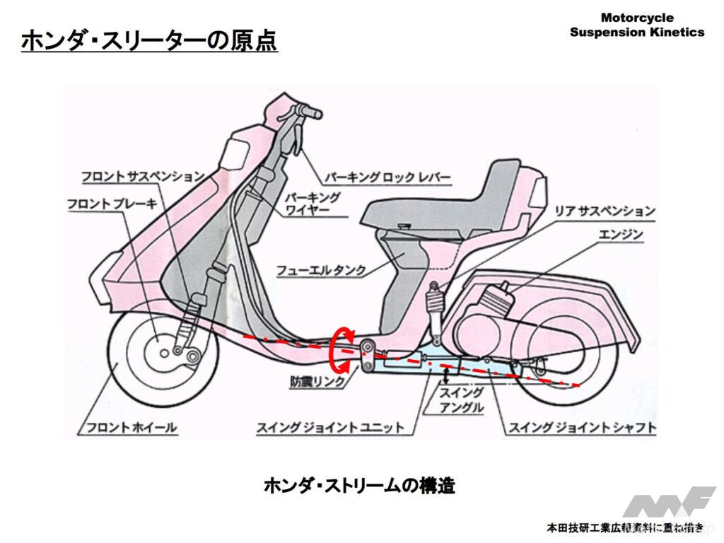 後軸まわりの機構はオリジナルと基本的に同一でしたが、フロントサスペンションはグレードアップされアシストリンク付きのトレーリングアーム式ボトムリンクになりました。このサスペンションは当時一世を風靡していたスクーターの「リード」からの流用と思われます。