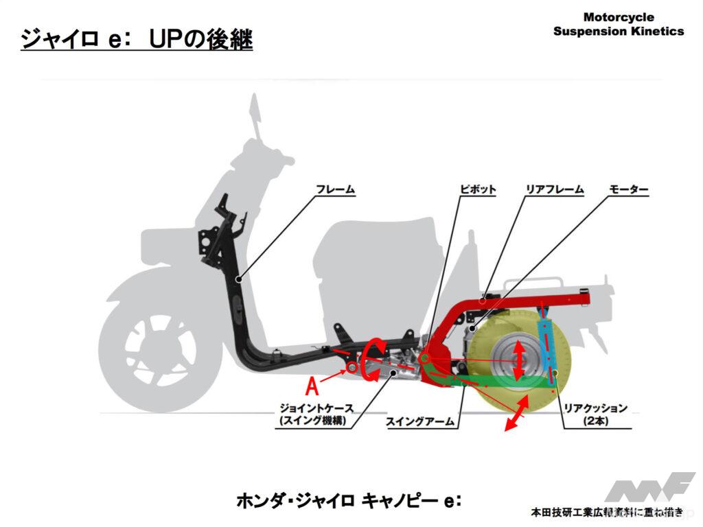 車体前後をスイング軸でつないだ構造や、停車時にスイング軸を固定させリヤにブレーキを掛けるパーキングロックは最新のジャイロe:にまで引き継がれています。