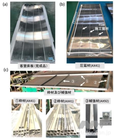 そして、図4(a)の客室床板をALFA-Xの中間車両に敷き詰め、全長約9m×幅約3mの客室床を完成した(図1)。マグネシウム合金製圧延材の鉄道車両への適用としては、世界最大級のサイズとなる。なお、客室床板1枚当たりの重量は約20kgで、アルミニウム製(約26kg)に比べて約23%の軽量化(1両当たり客室床全体で約50kgの軽量化)を実現した。
