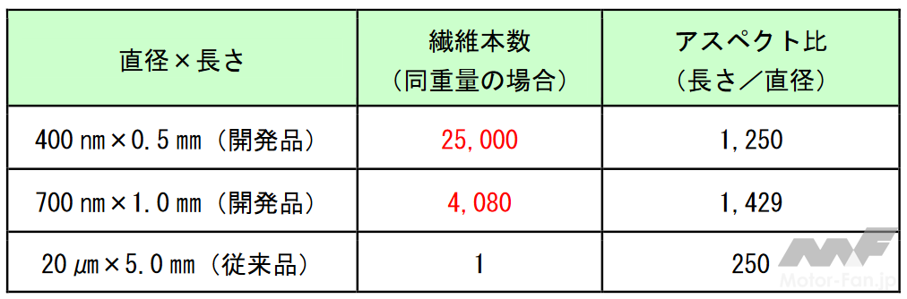 *2)アスペクト比:長さ/直径の比率。アスペクト比が大きければ大きいほど補強効果は高い