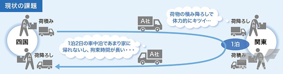 近年トラック輸送におけるドライバー不足が深刻化しており、輸送の効率化および労働負荷軽減が大きな社会課題となっている。特に、長距離ドライバーは、運転以外にも荷物の積み降ろしなどの荷役時間や、荷待ち時間により拘束時間が長く、ドライバーによる荷役作業は体力的な負担も大きいため、決して労働環境が良いとは言えない状況。さらに2024年から働き方改革関連法により「自動車運転業務における時間外労働時間の上限規制」が適用されることで、運送・物流業界の労働環境の整備が必要。また運送・物流業界ではトラックによるCO2排出量が多く、カーボンニュートラルの実現に向けてトラック輸送の効率化が求められている。