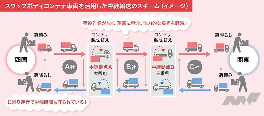 ・長距離輸送の効率化やドライバーの長時間労働の負荷軽減に、スワップボディコンテナ車両を活用した中継輸送がどの程度、効果があるかを検証