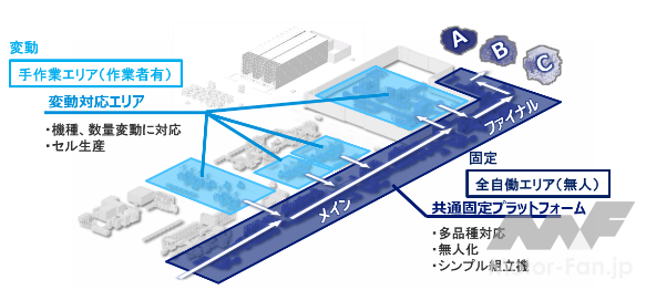 本製品のユニット組立ライン(安城第一工場)は、150kWフロントユニット、80kWフロントユニット/リアユニットの3機種をフレキシブルに混流生産することができる。全自動の共通固定プラットフォームと、変動対応エリアの組み合わせで、複数の異なる機種を生産できる「セル生産」が新たに導入された。今回の3機種のみならず、将来的により多様な種類のユニットを生産する場合にも、変動対応エリアの切り替え等により対応が可能。