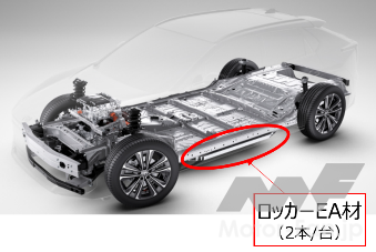 本製品は、床下電池ケースの側部(左右)にそれぞれ組付けられ、衝突(側突)時に電池を保護する部材。