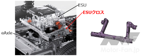 本製品は、今回トヨタ自動車が初めて導入したElectricity Supply Unit(ESU)を保持する部材。ESUは充電機能と電力分配機能を集約したユニットで、BEVの電気系統の中核を担う重要部品。