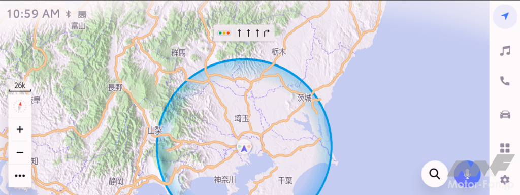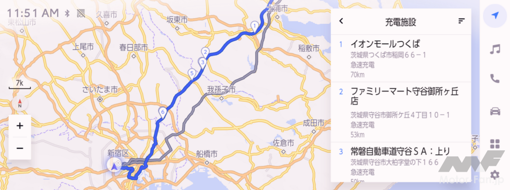 クラウド上の地図情報を活用し、交通情報や駐車場の空き情報をリアルタイムで取得するコネクティッドナビ。通常のナビゲーション機能に加え、目的地設定時にバッテリー残量に基づき目的地に到着出来ないと判断された場合、ルート沿いの充電施設をあらかじめ中継地点として提案する「移動支援」機能、航続可能エリアの円形表示、バッテリーが少なくなると周辺の充電施設を提案する充電施設検索など、BEVならではの機能にも対応している。