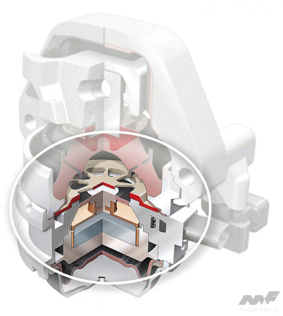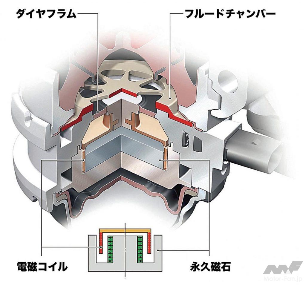 イラストは、アウディの電磁コイル式アクティブマウント。オーディオ用スピーカーの内部構造に似たコイル+マグネットの構造を持たせ、コンピューター制御による加振で振動を減衰するというシステム。本来パッシブに振動を吸収するだけのエンジンマウントと異なりアクティブに振動を抑え込む。