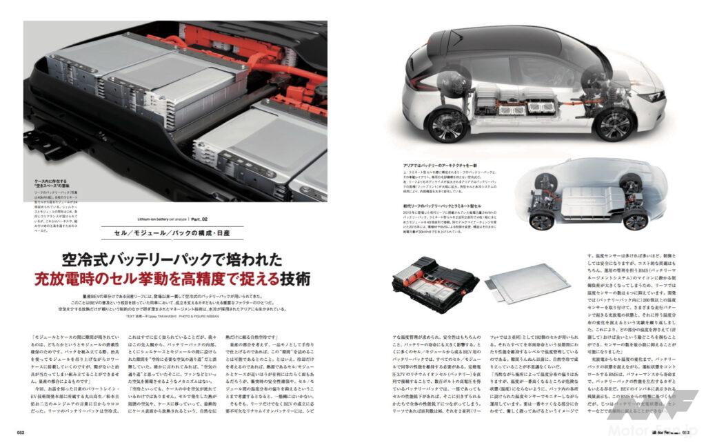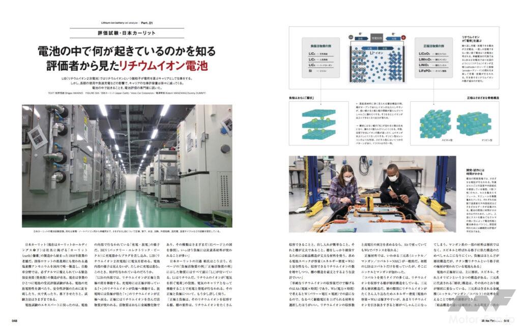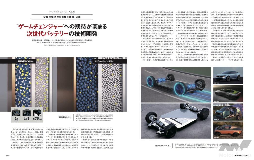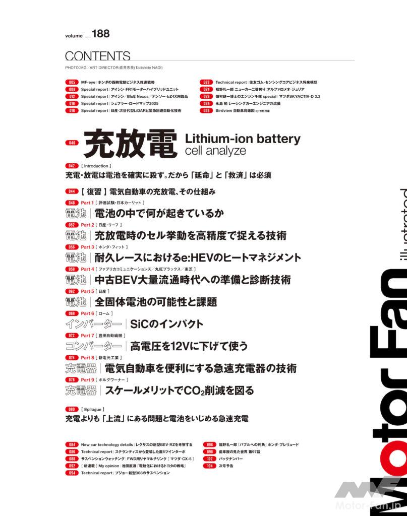 このほかにも、モーターとバッテリーの超有能なコーディネーターともいえるパワーエレクトロニクス、レースシーンにおけるバッテリーのマネジメント技術、将来的に急増する中古BEVに対する評価技術の確立と評価基準の検討など、「充放電」にまつわるさまざまなコンテンツで特集を構成しています。