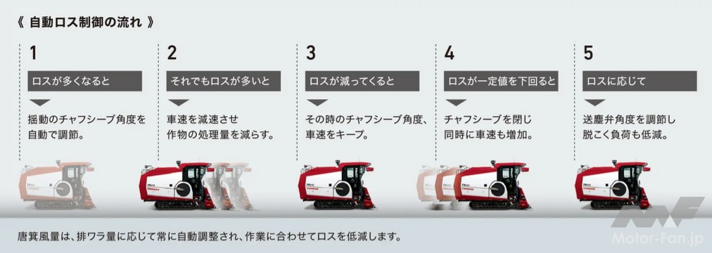 自動ロス制御はヤンマー独自の自動制御技術で、こぎ胴・揺動での籾のロスを検知し選別・車速・送塵・風量を自動調節する。選べる5段階の制御レベルに応じて設定されたロスの上限値を超えると制御が働きロスを低減する。本機能を自動モードと併用することで、安定的な刈取作業を自動で行うことが可能になる。