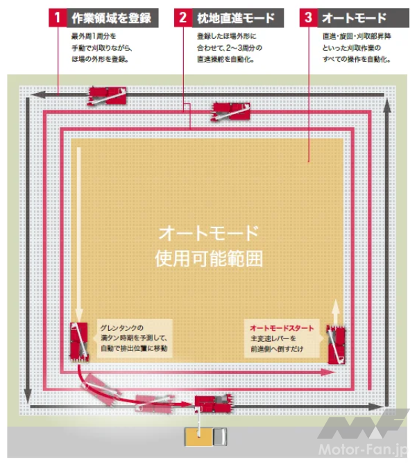 ・「枕地直進モード」:登録したほ場外周に合わせて自動直進を行うためオペレーターの負担を軽減する。 ・「オートモード」:直進・旋回・刈取昇降といった刈取作業のすべての操作を自動化。作業に不慣れなオペ レーターでも熟練者並みの精度で自動作業を行うことができる。 ・「直進モード」:設定した基準線に平行して自動直進。オートモードが使用できないほ場でも活躍する。