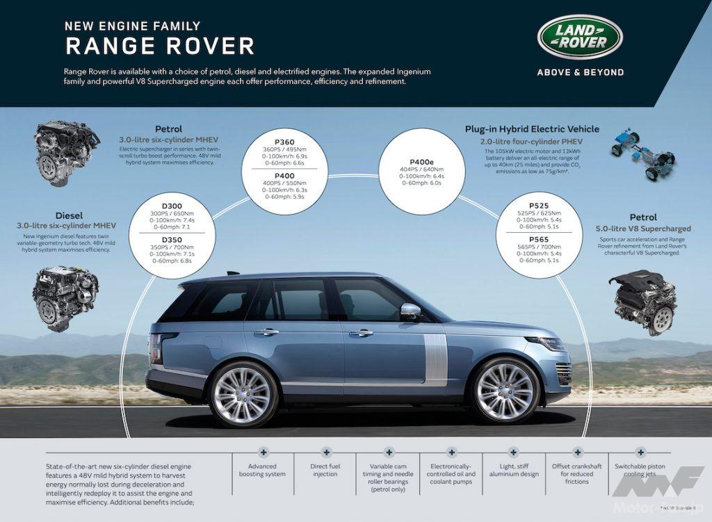 レンジローバーD350 MHEV エンジン型式:Ingenim Diesel エンジン形式:直列6気筒DOHCディーゼルターボ 排気量:2997cc ボア×ストローク:83.0mm×92.32mm 圧縮比:15.5 最高出力:350ps(258kW) 最大トルク:700Nm