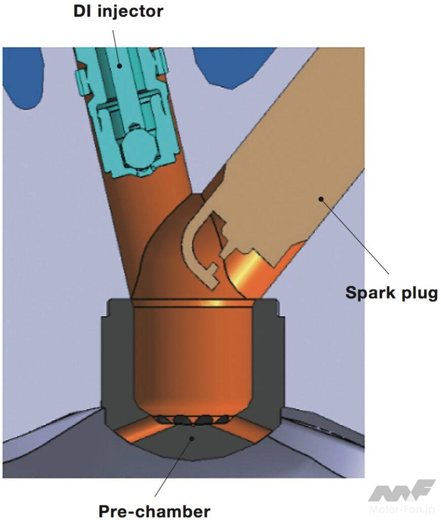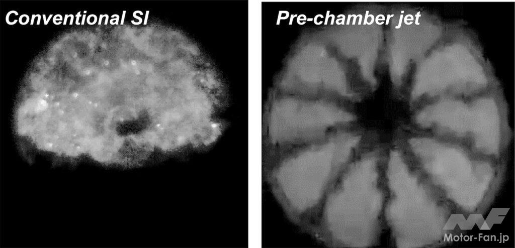 副室内で主室と同じA/Fの混合気に点火し、強力なジェット噴流によって主室の混合気を急速燃焼させるのが、ストイキ副室ジェット燃焼(パッシブ・プレチャンバー)。ジェット燃焼がピストン冠面に触れると冷却損失に繋がるので、噴流を避ける(かつ高い容積比を確保するための)冠面形状となっている。SI燃焼の場合は点火プラグの電極を中心に火炎が広がるのに対し、副室ジェット燃焼は瞬間的に燃える。