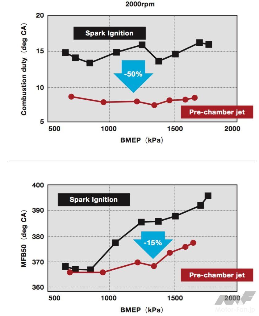燃焼期間を示しているのが上のグラフ。副室ジェット燃焼はSI燃焼の半分以下で燃焼期間が終了している。言い換えれば、燃焼速度は倍以上。下のグラフの縦軸は燃料質量の50%が燃焼したときのクランク角(MFB 50=Mass Fraction of Burned fuel 50%)を示している。副室ジェット燃焼はSI燃焼よりも早いタイミングで燃焼が終了しており、ノッキング低減効果が高い。かつ、高負荷側ほど効果が高いことを示している。