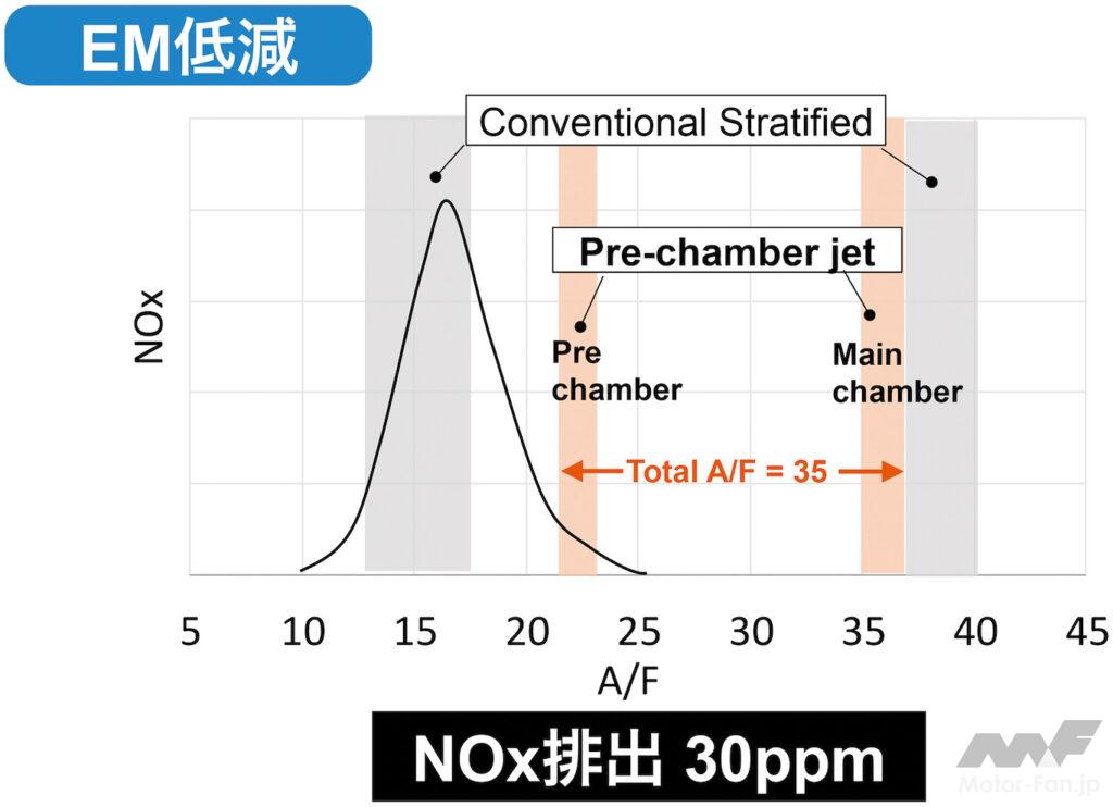 副室と主室のA/Fを示すグラフ。小容積の副室でごくわずかではあるがNOxが発生するため、その処理(酸素過剰な環境のため三元触媒は使えない)が課題となる。