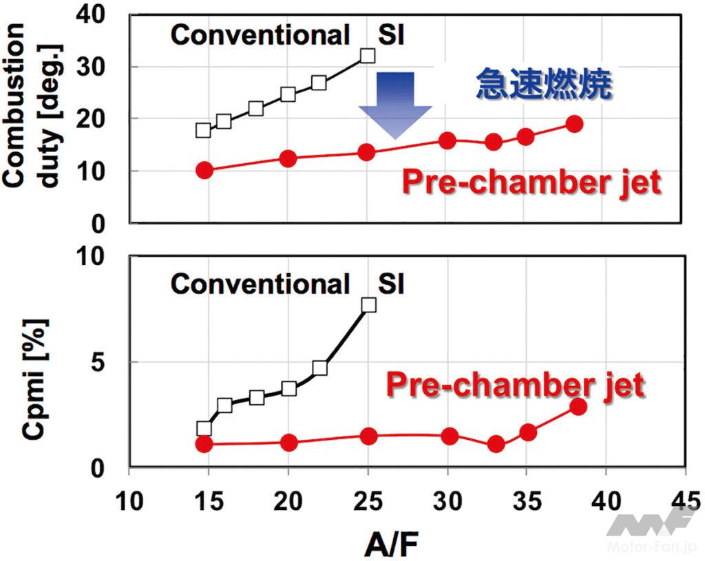 上のグラフは、急速燃焼によって火炎伝播リーン燃焼よりも主燃焼期間が短くなっていることを示している。下のグラフの縦軸は燃焼変動率を示しており、A/F35までは燃焼が安定していることを示している。