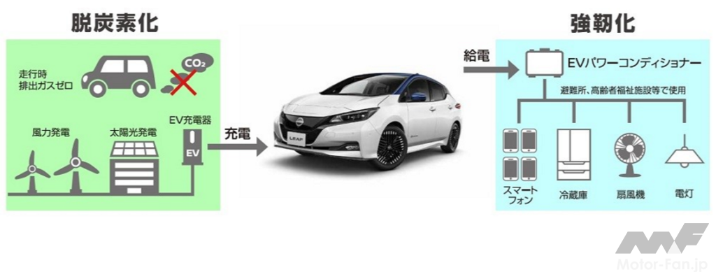 一方、日産自動車は、EVならではの新たな価値やワクワクを提供し続けるとともに、2018年5月より、EVの普及を通じて、脱炭素、災害対策、エネルギーマネジメント、観光、地方での交通課題などの地域課題解決を目指す、日本電動化アクション『ブルー・スイッチ』を、全国の自治体や企業、販売会社と共に推進させている。また、2030年代早期には、主要市場で投入する新型車すべてを電動車両にすることを宣言、電動化をリードしながら、SDGsの達成やカーボンニュートラルの実現に向けた取り組みを加速している。