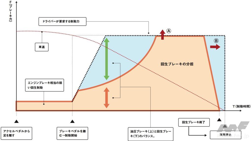 「例えば、高速走行時に制動した場合は、(エネルギーを受け入れる)バッテリーの許容量でこのラインが決まる部分があります。いかに巡航スピードが高い領域から回生ブレーキを分担させられるか。加えて、応答遅れを極力なくし、調圧を微小にしてフィーリングを作り込んでいくかが開発の課題です。停止間際は回生ブレーキをストンと落としますが、このとき、ドライバーに気づかれないように油圧を補填する技術がポイントです。かつては緩かった勾配がどんどん立ってきて、本当の停止寸前まで回生を取りきるところまで進化しています」